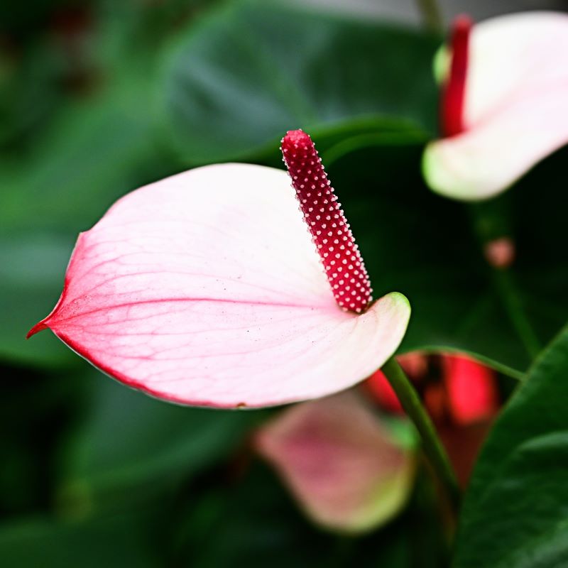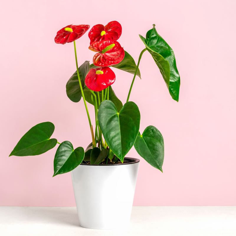L’Anthurium, qui fait partie de la famille des arums, fleurit très longtemps. Cette plante se reconnaît à son feuillage vert luisant, à ses bractées colorées et à son épi allongé qui donne à la fleur un air sympathique. Cet épi lui doit aussi le surnom de « fleur flamant rose », car avec un peu d’imagination, on peut la comparer au célèbre échassier rose sur une patte.