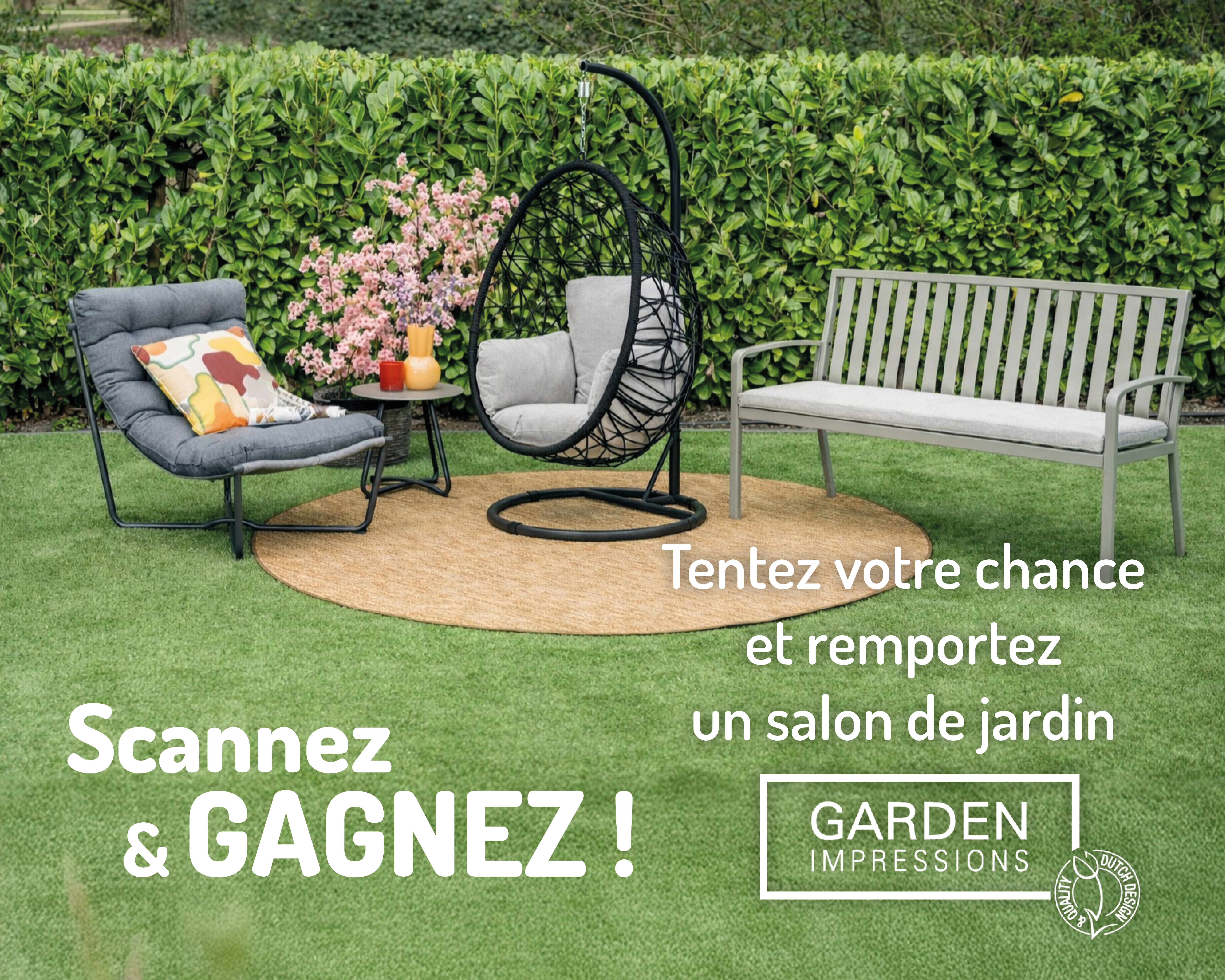 Scannez le QR code en magasin, répondez à 2 questions et tentez de gagner, entre autres, une chaise suspendue Panama, un set de balcon Danzig ou un banc de jardin Pisa de Garden Impressions.
