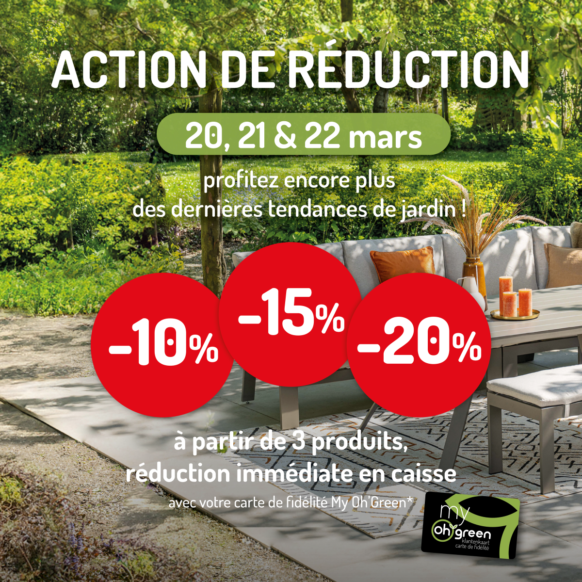 La réduction est valable sur tout l’assortiment, à l’exception des boissons, services, abris de jardin et serres, commandes, livres, cartes cadeaux, bouteilles de gaz, horeca et animaux vivants. Ceux-ci comptent toutefois pour le nombre minimum d’articles. Non cumulable avec d’autres actions (de réduction) en cours. Valable dans toutes les jardineries Oh’Green du 20.03.2026 au 22.03.2026 inclus. Non valable dans la webshop