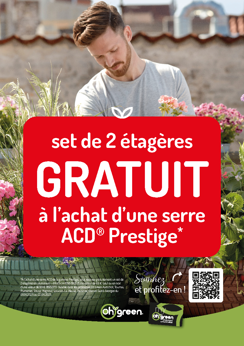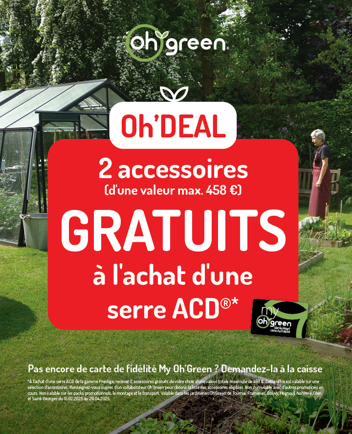 *À l’achat d’une serre ACD de la gamme Prestige, recevez 2 accessoires gratuits de votre choix d’une valeur totale maximale de 458 €. Cette offre est valable sur une sélection d’accessoires. Renseignez-vous auprès d’un collaborateur Oh’Green pour obtenir la liste des accessoires éligibles. Non cumulable avec d’autres promotions en cours. Non valable sur les packs promotionnels, le montage et le transport. Valable dans les jardineries Oh’Green de Aarschot, Frameries, Gouvy, Hognoul, Louvain-la-Neuve, Naninne, Olen, Saint-Georges et Tournai du 26.09.2025 au 09.11.2025.