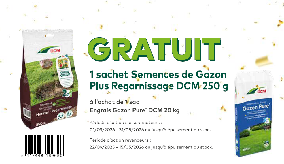 Recevez un sachet Semences de Gazon Plus Regarnissage DCM 250 g GRATUIT à l'achat de 1 sac Engrais Gazon Pure DCM de 20 kg*