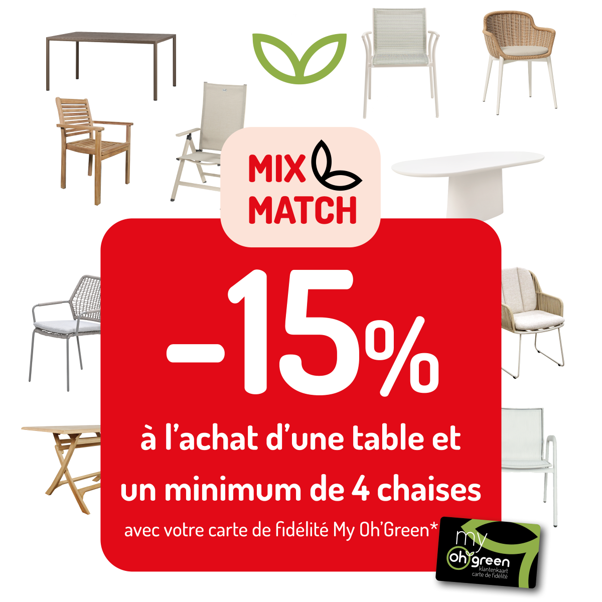 * -15% à l’achat d’une table et d’un minimum de 4 chaises ou d’une table avec 3 chaises et un banc ou d’une table avec 2 bancs. Non cumulable avec d’autres promotions en cours. La réduction sera calculée à la caisse et appliquée sur le prix de vente conseillé. Valable uniquement pour les détenteurs de la carte de fidélité My Oh’Green dans toutes les jardineries Oh’Green du 01.04.2026 au 30.04.2026 ou jusqu’à épuisement des stocks.