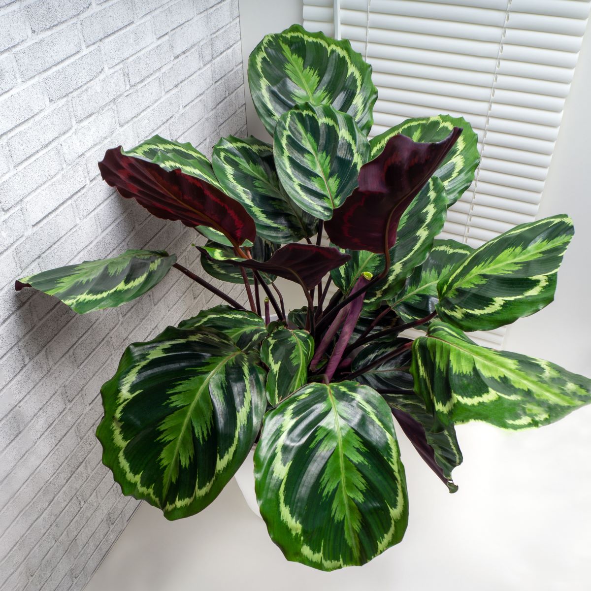 • Calathea Medallion: een van de populairste soorten, en terecht. Haar blad lijkt op een kunstig medaillon, met diepe donkergroene randen en lichtere patronen in het midden. De paarse onderkant voegt een verrassend kleurcontrast toe dat je pas ziet als de bladeren bewegen.