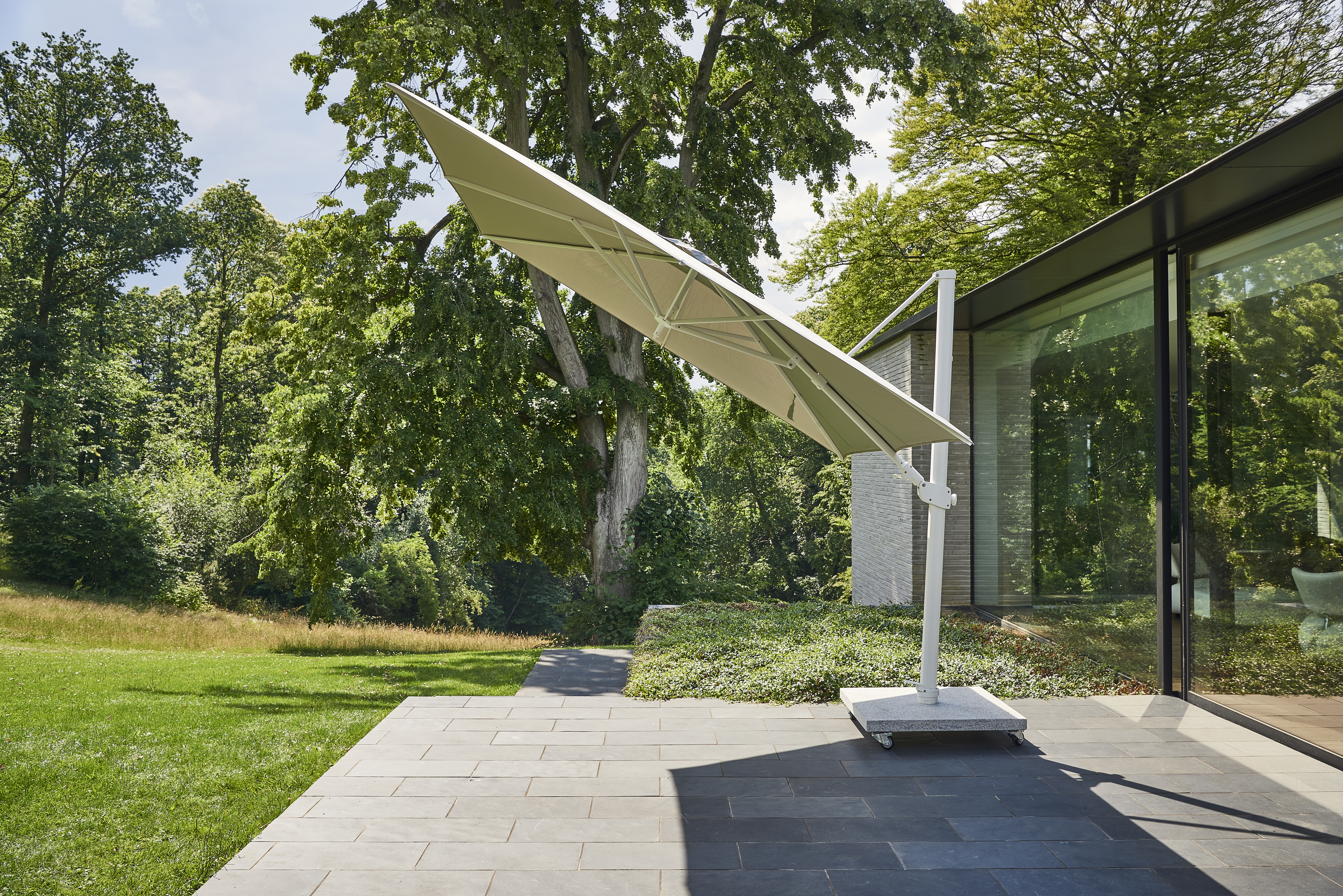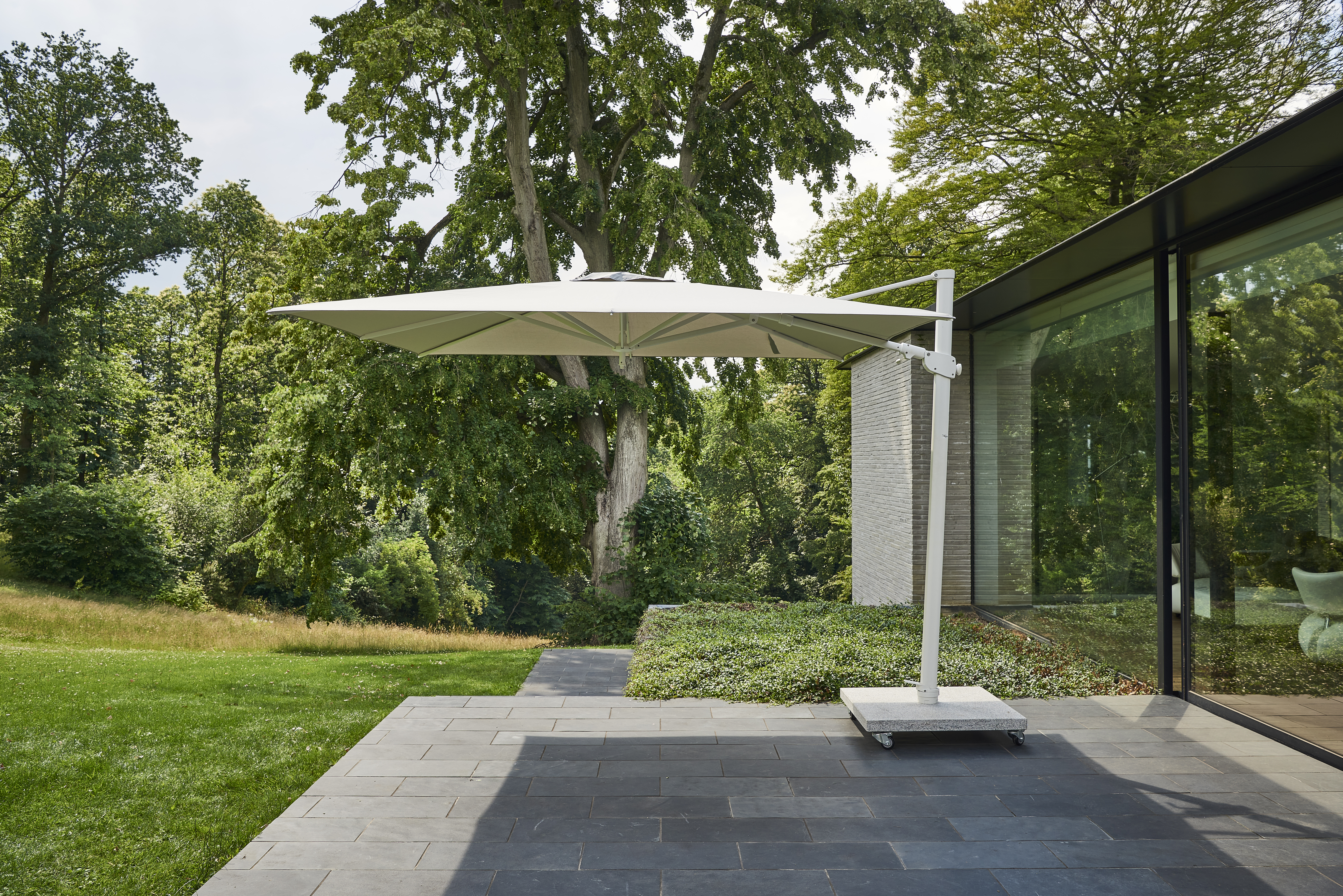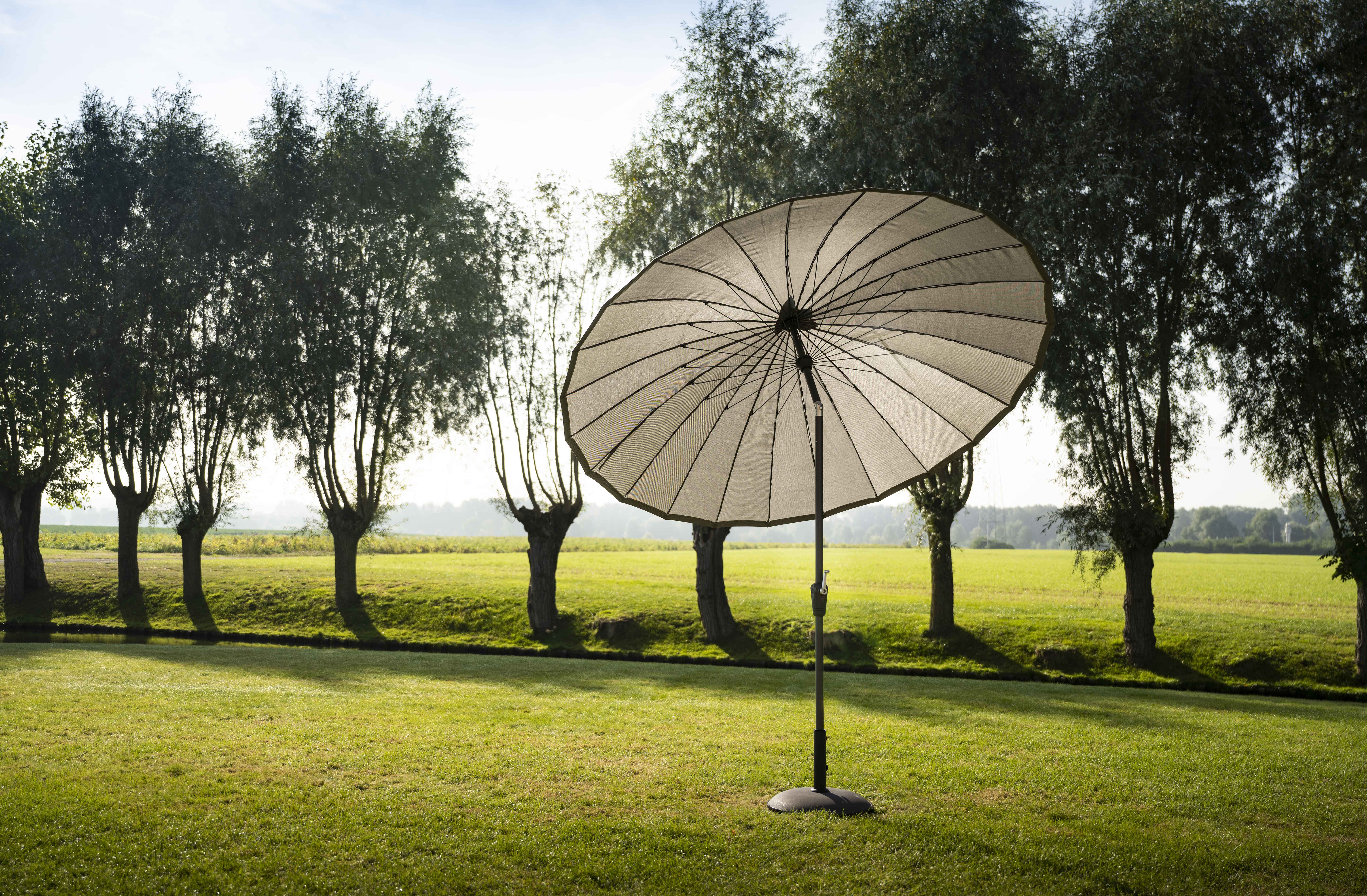 • Een zweefparasol of hangparasol, met een mast aan de zijkant, leeft op iets grotere voet. Voordeel is dat de stok niet in de weg zit, je kunt hem in alle richtingen draaien en de parasol geeft veel schaduw.