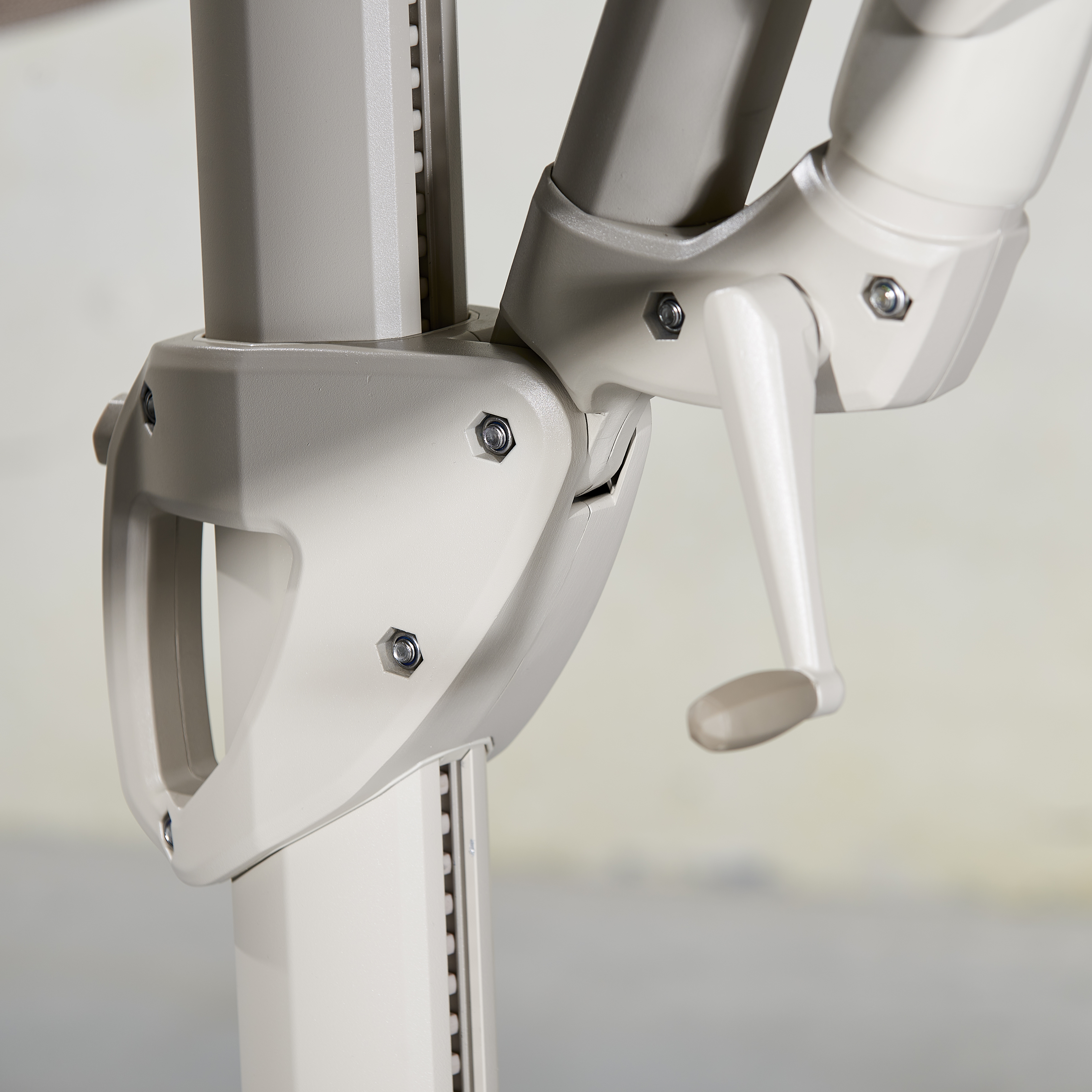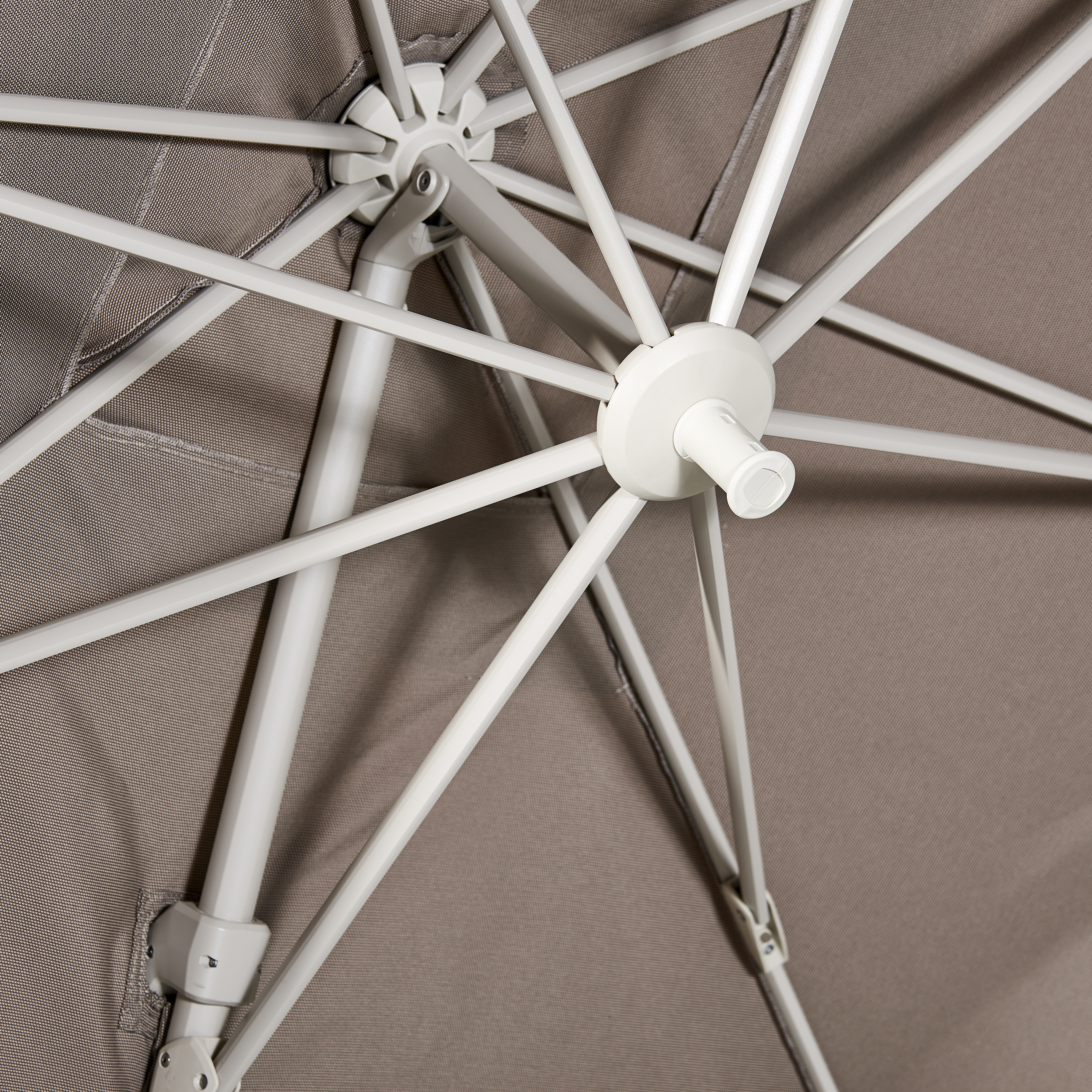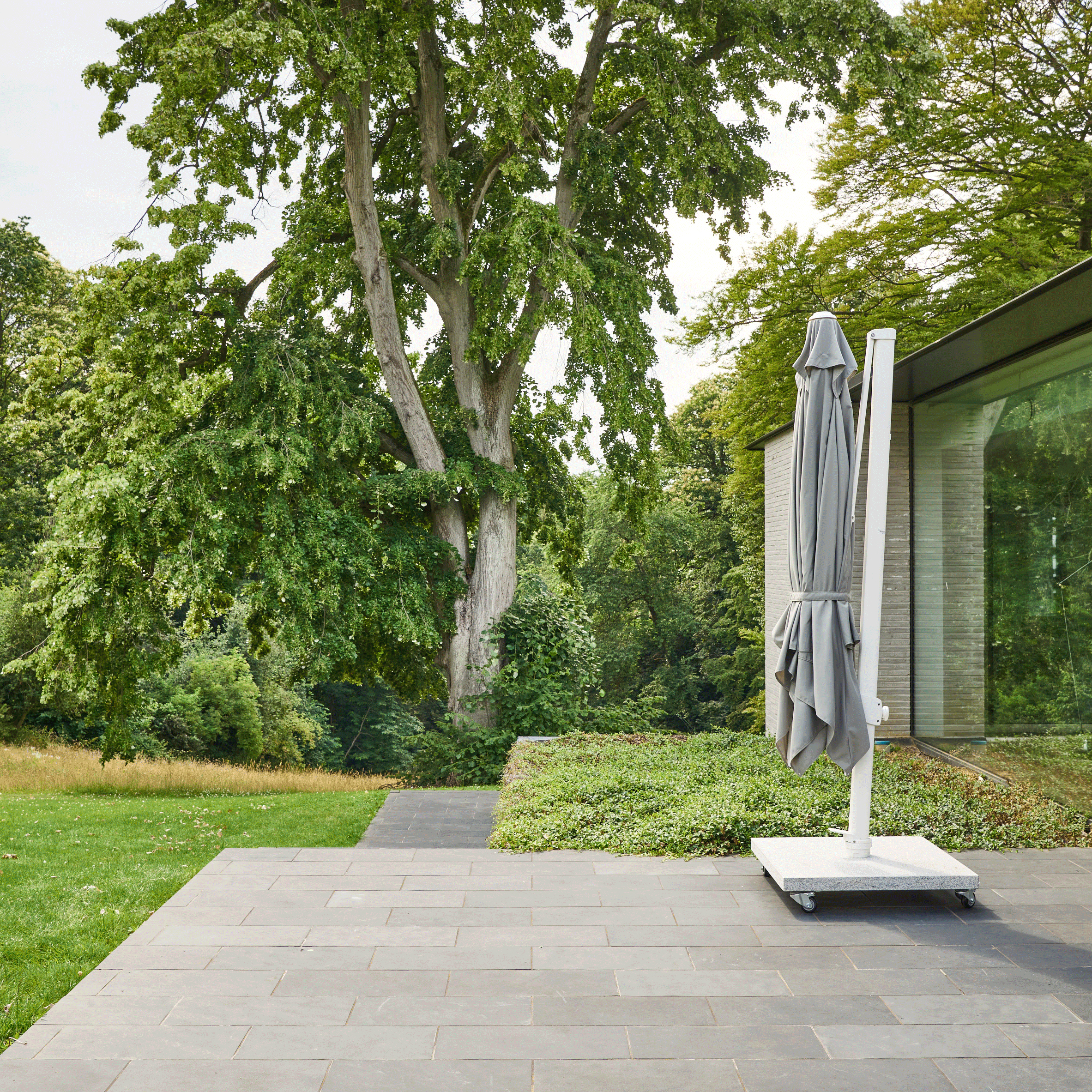 • Een zweefparasol of hangparasol, met een mast aan de zijkant, leeft op iets grotere voet. Voordeel is dat de stok niet in de weg zit, je kunt hem in alle richtingen draaien en de parasol geeft veel schaduw.
