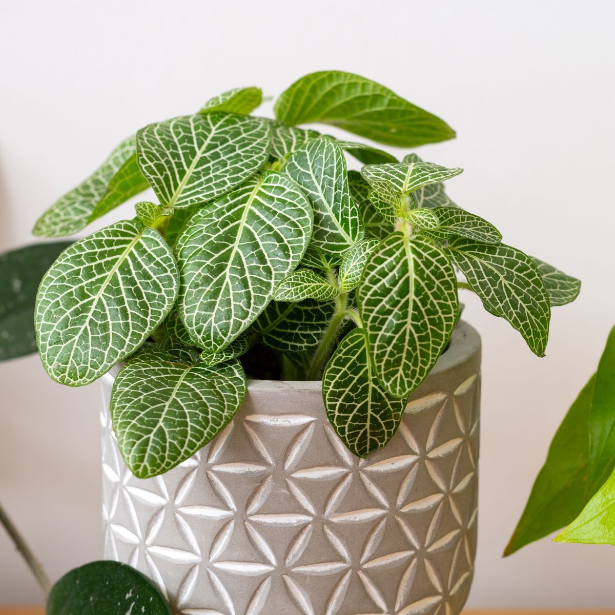 • Fittonia: bekend als ‘mozaïekplantje’, met zijn opvallende nerven en miniatuurformaat.