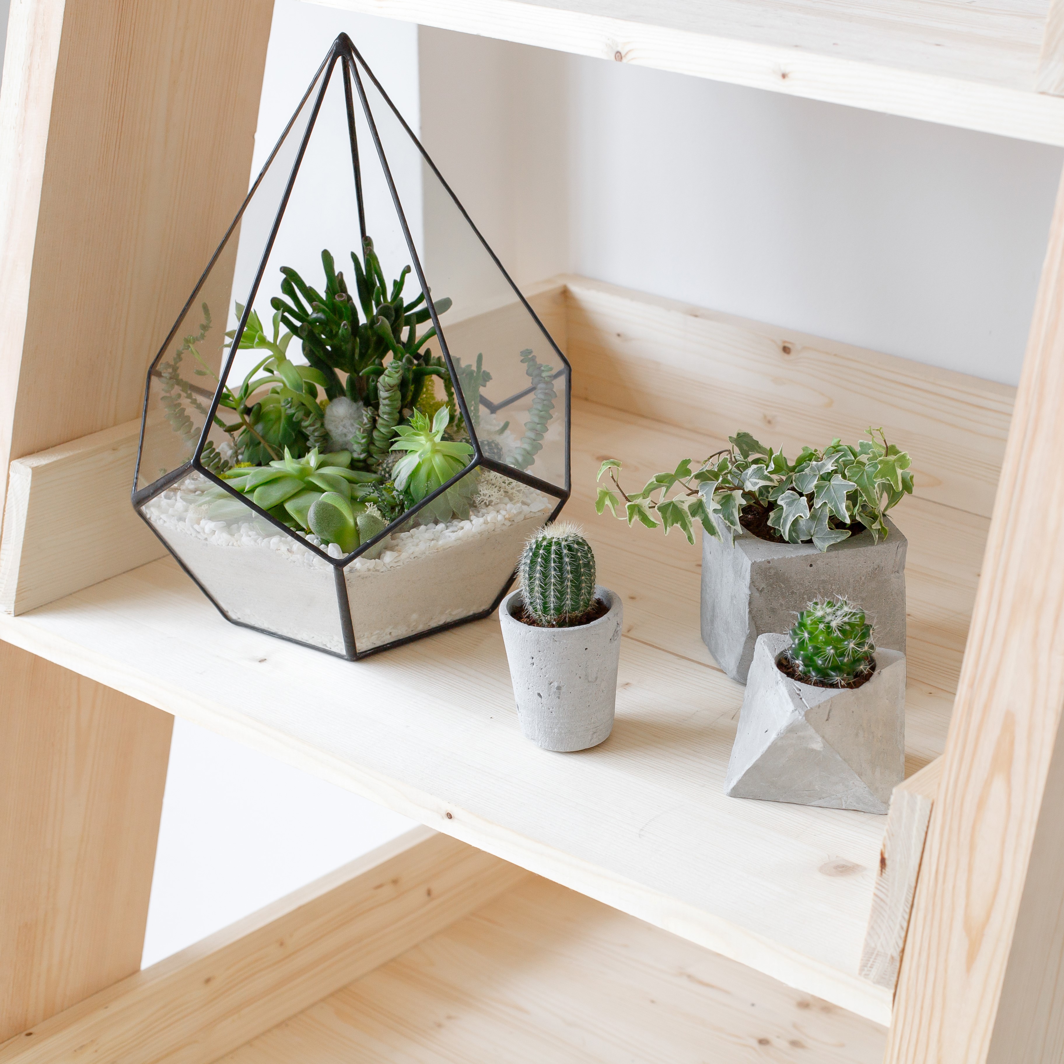 Zet meerdere miniplantjes bij elkaar in een grote schaal of op een etagère voor een mini jungle effect. Combineer met verschillende hoogtes, kleuren en bladvormen voor een speels en levendig geheel.