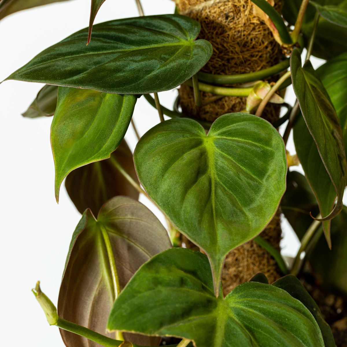 Philodendron scandens groeit in de natuur zelden over de grond. Hij klimt liever omhoog langs bomen om het zonlicht te bereiken. Zet je hem in huis naast een mosstok of plank, dan volgt hij diezelfde strategie alsof hij nog steeds in het regenwoud staat.
