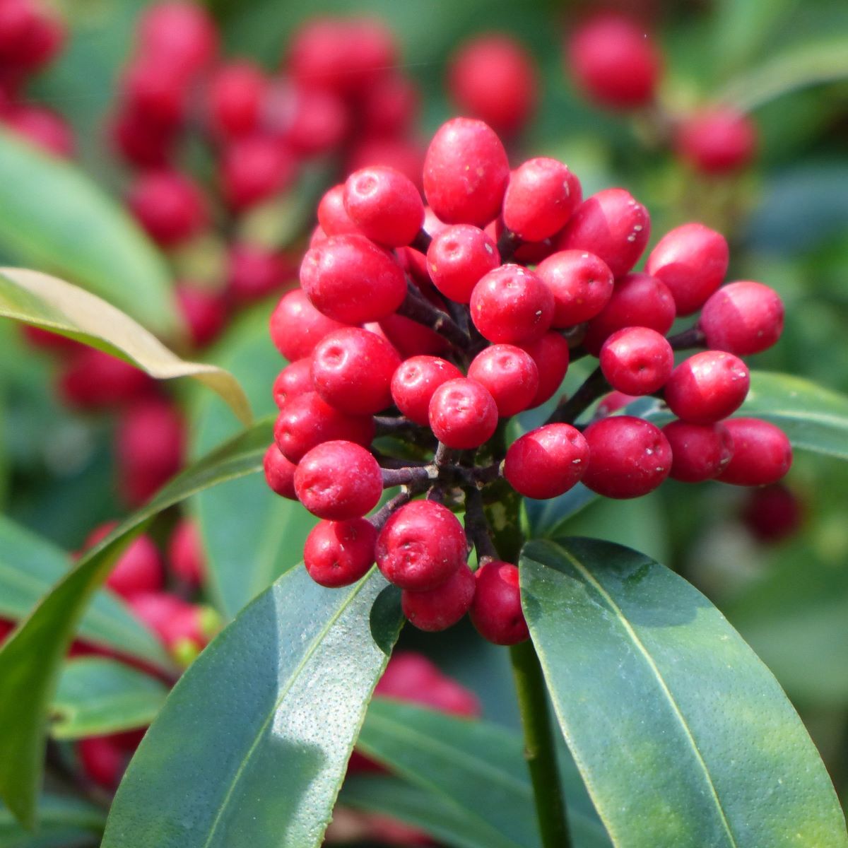 Skimmia japonica: een van oorsprong Japanse schoonheid die opvalt door zijn mooie mix van diepgroene bladeren en vuurrode besjes. Die laatste zijn helaas niet eetbaar, maar kun je gemakkelijk verwerken in bloemstukken en zelfs kerstkransen. Met andere woorden: zowel binnen als buiten heb je plezier aan de struik.