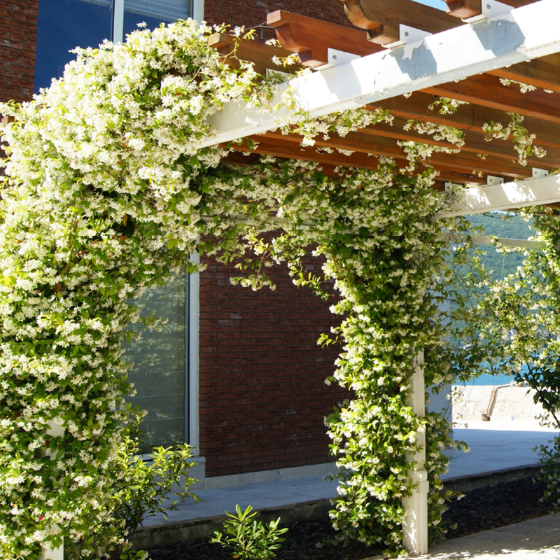 De Trachelospermum ken je ook als de Toscaanse jasmijn of sterjasmijn. Het is een populaire klimplant die opvalt door haar witte, stervormige bloemen die sierlijk bloeien. Ze verspreiden een intense jasmijngeur die je naar de mediterrane zomers in Zuid-Europa katapulteert. En dankzij haar wintergroene bladeren blijft je muur, schutting of omheining ook tijdens de winter mooi groen.