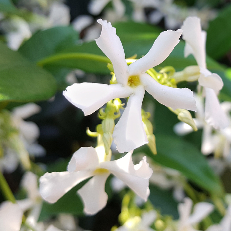 De naam is eigenlijk slecht gekozen. Hoewel de Trachelospermum op een jasmijn lijkt en ook bijna hetzelfde ruikt, is het geen jasmijn. Ze behoort tot de familie van de maagdenpalmen. Maar het is net aan die vergelijkbare geur en bloemvorm dat ze haar naam te danken heeft. :-)