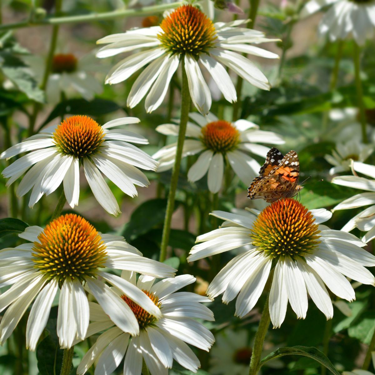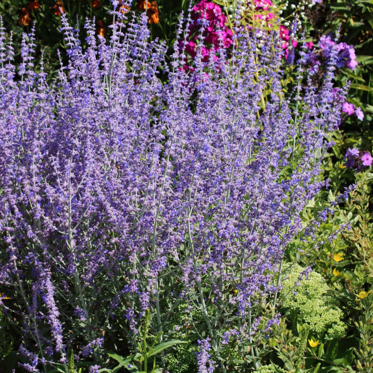 Perovskia ‘Blue Spire’, Echinacea ‘Alba’ en Verbena bonariensis trekken het seizoen door tot in het najaar