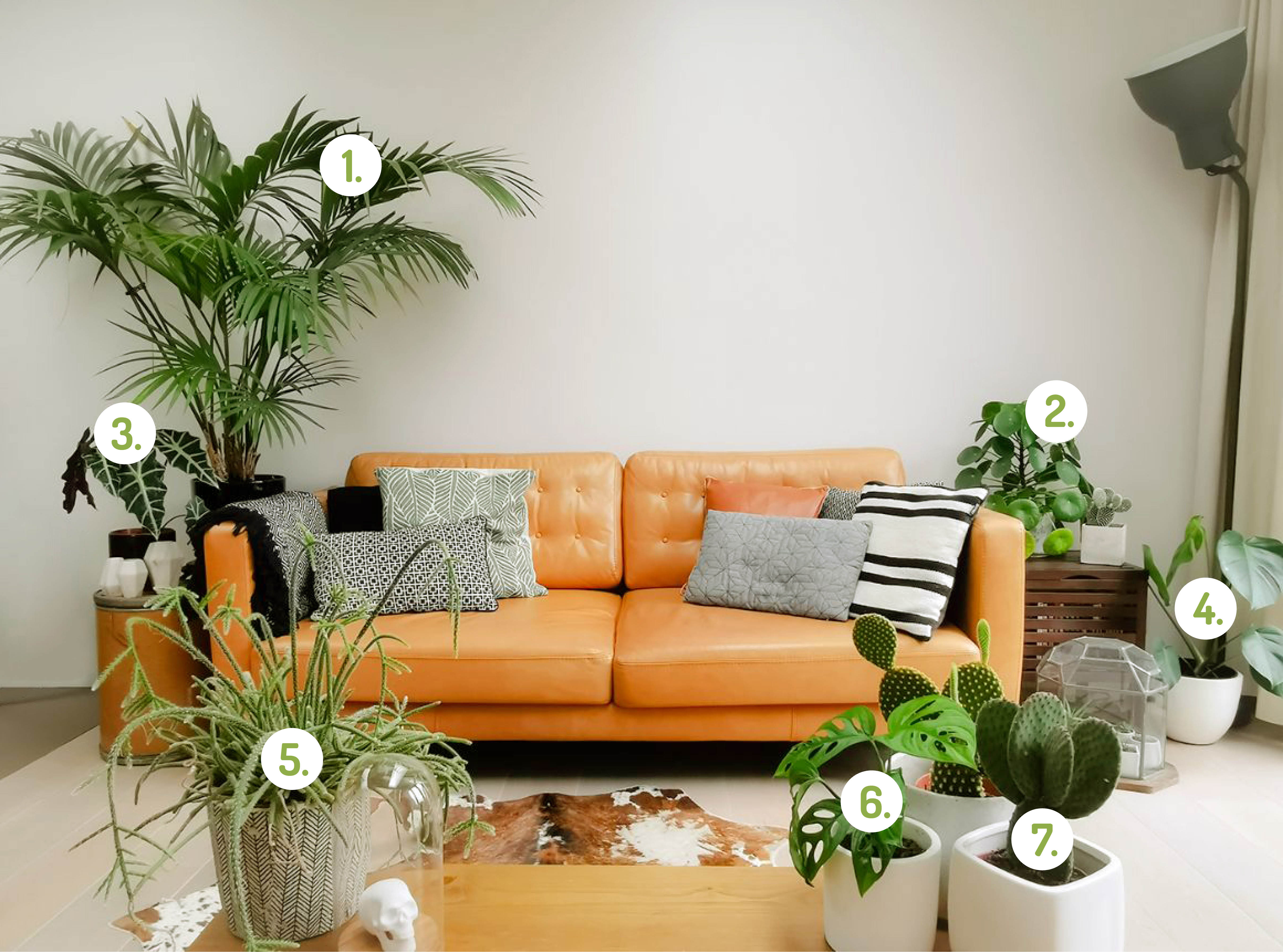 1) Kentia 2) Pilea 3) Alocasia Amazonica 4) Monstera Deliciosa 5) Rhispalis 6) Monstera Obliqua 7) Opuntia