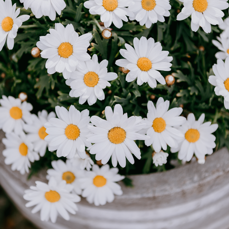 April weet soms niet of hij wil stralen of huilen. Maar de margrietstruik? Die twijfelt geen seconde. Met zijn fonkelende witte bloemblaadjes en zonnige gele hart tovert hij instant sunshine vibes in je tuin, op je terras of balkon. Alsof de zon een miniversie van zichzelf heeft nagelaten, om het wispelturige aprilweer een beetje goed te maken.
